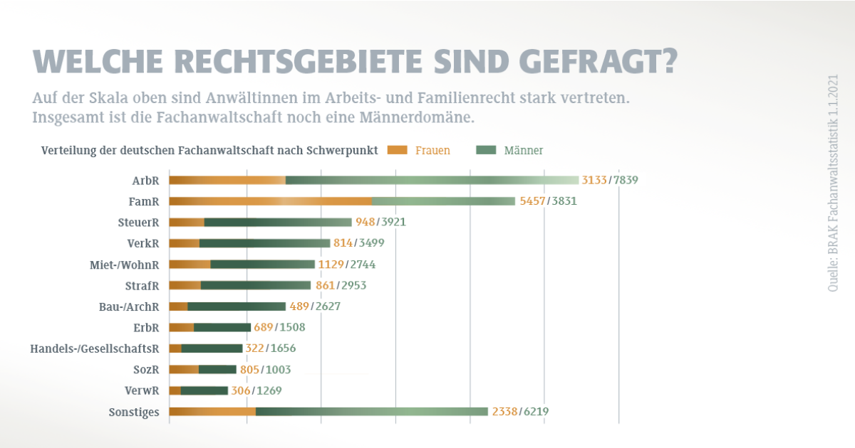 Die Grafik verdeutlicht die starke Vertretung von Frauen im Familienrecht, während in Bereichen wie Erbrecht und Arbeitsrecht Männer überwiegen. Die Anwaltskanzlei Boßert in Hamburg setzt ihren Fokus auf das Familien- und Erbrecht, wo sie Mandanten mit individueller Beratung und langjähriger Erfahrung unterstützt.
